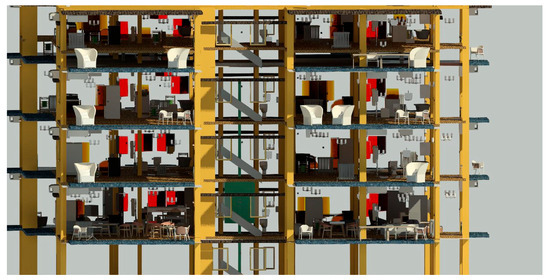 The neighborhood under study is in the municipality of Chalandri in Athens, Greece. The neighborhood is comprised of eight complex buildings, with seven of them being multi-story residential apartment buildings (Figure 2) and the remaining one being a two-story high school with a gymnasium (Figure 3). Figure 4 and Figure 5 show the detailed interior of the BIMs. Figure 6 and Figure 7 present some 3D property units of the BIMs. Figure 8 shows the modeled Restrictions of the sewer system and road network [2].