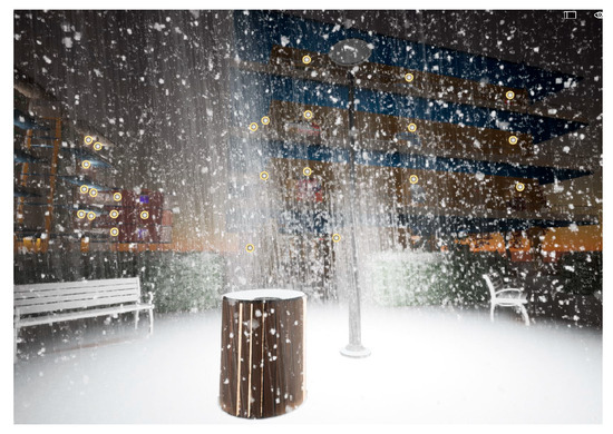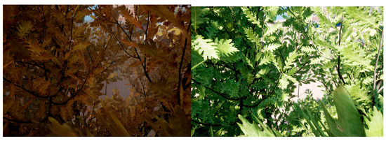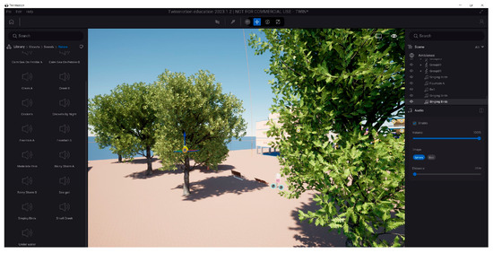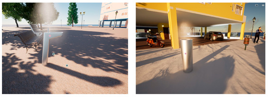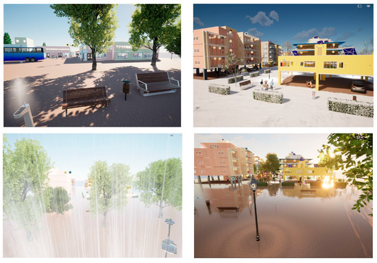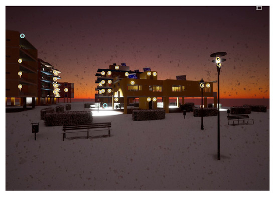 The DT of the neighborhood is presented through a wide array of dynamic effects and artificial options such as the configuration of wind intensity and direction, movement of clouds, reflection of puddles, movement of fallen leaves, and water streaming (Figure 14). Sounds are also added in the model, adding a deeper layer of realism, i.e., the sound of water being sprayed from a sink, a doorbell or alarm ringing, birds chirping, etc. (Figure 15).