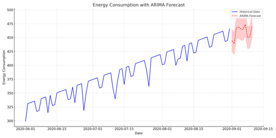 The blue continuous line represents the historical data while the red dashed line is the forecast of the ARIMA model. Therefore, the proposal offers possible simulations and future predictions of the energy consumption of each modelled household in the Digital Twin of the neighborhood.