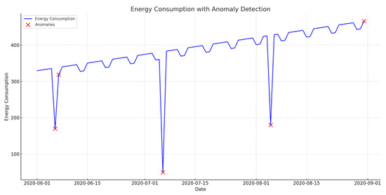 The upper diagram has been created by feeding it the generated data of the AI-generated sensors of the neighborhood under study (Figure 27). The red crosses mark the anomalies that are detected through the functionality of the sensors from June to September 2020. The first and last anomalies can be omitted as they represent the first and last time that the model received data, respectively. The biggest anomalies are detected during the beginning of July and August, respectively. Therefore, the proposal offers anomaly detection regarding the functionality of each device and system inside the BIMs.