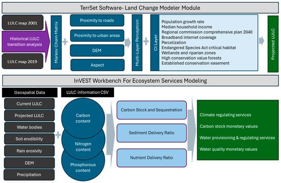 Developments in remote sensing, machine learning, and GIS technologies can help to better conceptualize and analyze the ES consequences of land use and land cover (LULC) changes. Several modeling toolsets have been developed to visualize and quantify ES dynamics [,]. The complexity associated with assessing non-market values of ESs is a common obstacle in environmental economics [], but platforms such as the Integrated Valuation of Ecosystem Services and Tradeoffs (InVEST) toolset enable users to estimate ES economic values across large spatial areas []. Substantial research effort has utilized InVEST models to calculate the dynamics and value of biodiversity, land connectivity, and species habitat [,,], to model the hydrological impacts of land-use changes [,,], to evaluate carbon stocks and sequestration [,], to estimate provisioning and regulate ESs under alternative scenarios, and to support management decision-making [,,,].
