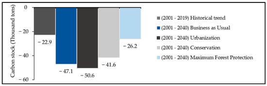 The carbon sequestration model was employed to assess the effects of projected LULC changes on carbon stock and sequestration within the UFW. The historical trend observed from 2001 to 2019 reveals a decline of over 23,000 tons in carbon stock. Simulation results for future scenarios indicate that the carbon stock continues to decrease most sharply in the Urbanization scenario and decreases only slightly in the Maximum Forest Protection scenario compared to the historical trend (Figure 3).