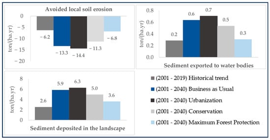 The results of the SDR model, including the amount of sediment deposition, avoided erosion and avoided sediment export, are presented in Figure 4. The historical trend spanning from 2001 to 2019 illustrates a decline in the landscape’s capability to stabilize soil and avoid water erosion, implying more sediment deposited in waterbodies and on land. Projecting the SDR model for development scenarios indicates the persistence of this historical trend even under the Maximum Forest Protection scenario. Under the Urbanization scenario with its considerable decrease in Deciduous/Mixed Forest and Hay/Pasture land-use classes, we expect an annual increase of 1.9 kg/ha in the sediment delivered to water bodies, 16.8 kg/ha in soil deposited on land, and an annual decline of 36.7 kg/ha in avoided erosion from 2019 to 2040. Avoided erosion represents ecosystems’ capability to stabilize the soil. The Conservation scenario shows similar outcomes to the historical trend, suggesting that this relatively “realistic” conservation scenario only modestly ameliorates sedimentation (Figure 4).