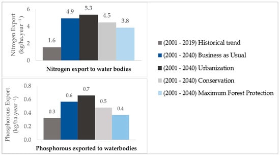 The outputs of the NDR model, including estimates of phosphorous and nitrogen surface load and surface export, are shown in Figure 5. Surface load represents the total nutrients liberated into the watershed from all land covers without considering the natural landscape’s contribution in filtering the water, while surface export represents the total amount of nutrients that eventually reach water bodies by surface flow []. NDR results for the UFW indicate that from 2001 to 2019, both the nutrient load and nutrient export increased. In other words, while the amount of nutrient load increased as a result of agricultural and forestry practices, urban storms, and other point and non-point source pollution, the natural landscape’s capability to retain nutrients and avoid nutrients export to water bodies decreased. Projected results for 2040 represent an increasing nutrient delivery pattern under all scenarios. Even under the Maximum Forest Protection scenario, nitrogen load, and nitrogen export are high, which reflects the use of nitrogen-rich fertilizers in pine plantations and the conversion of other LULCs to open-space developments.