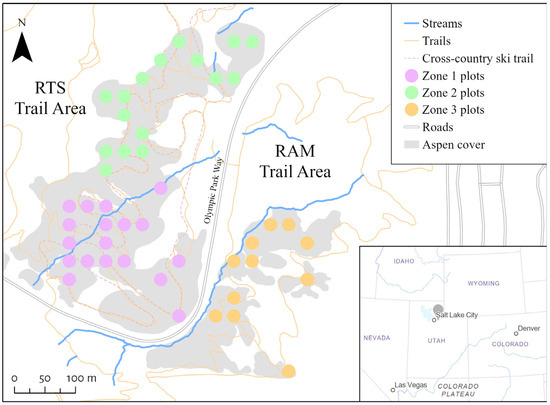 The RTS/RAM trail areas range from 1963.8 m to 2109.7 m in elevation, with an average of 2036.8 m, and slopes ranging from 0.2% to 35.4% trending west/southwest. It covers 1429.4 ha−1, with an estimated 11.6 ha−1 (~0.8%) of this area dominated by aspen forests. The surrounding, steeper hillsides are dominated by Gambel oak (Quercus gambelii Nutt.) and other tall shrubs. The area surrounding the aspen and oak forests consists of shrubs, grasses, and forbs. Other tree species are lightly scattered throughout the forest, including bigtooth maple (Acer grandidentatum Nutt.), Rocky Mountain juniper (Juniperus scopulorum Sarg.), subalpine fir (Abies lasiocarpa Nutt.), and white fir (Abies concolor Lindl.). Large herbivores in RTS/RAM include North American elk (Cervus elaphus L.), mule deer (Odocoileus hemionus Raf.), and moose (Alces alces L.). Though the study area was likely affected by historic livestock grazing, there are no recent uses for domestic animals in this area. From 1991 to 2020, the annual average precipitation for Snyderville, Utah is 44.34 cm, mostly in the form of snow [59]. The average annual temperature was 6.78 °C in neighboring Park City, Utah from 2006 to 2020 [59].
