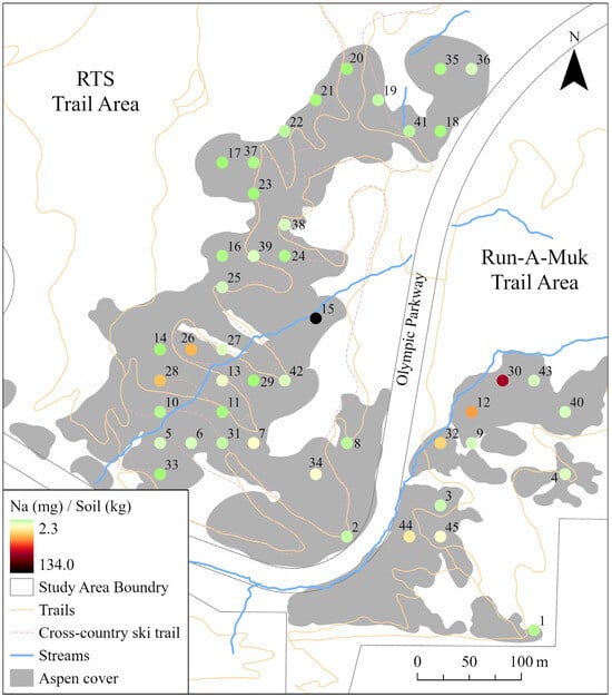 Results from the soil testing yielded unusually high results for Na at plot 15, and high results for six additional plots. Figure 2 displays Na levels at each plot, with red and black plots having the highest levels of Na and green plots having the lowest. Visually, sample locations with high values appear closer to streams. This assertion was tested further below (see Section 3.4; Figure 2).