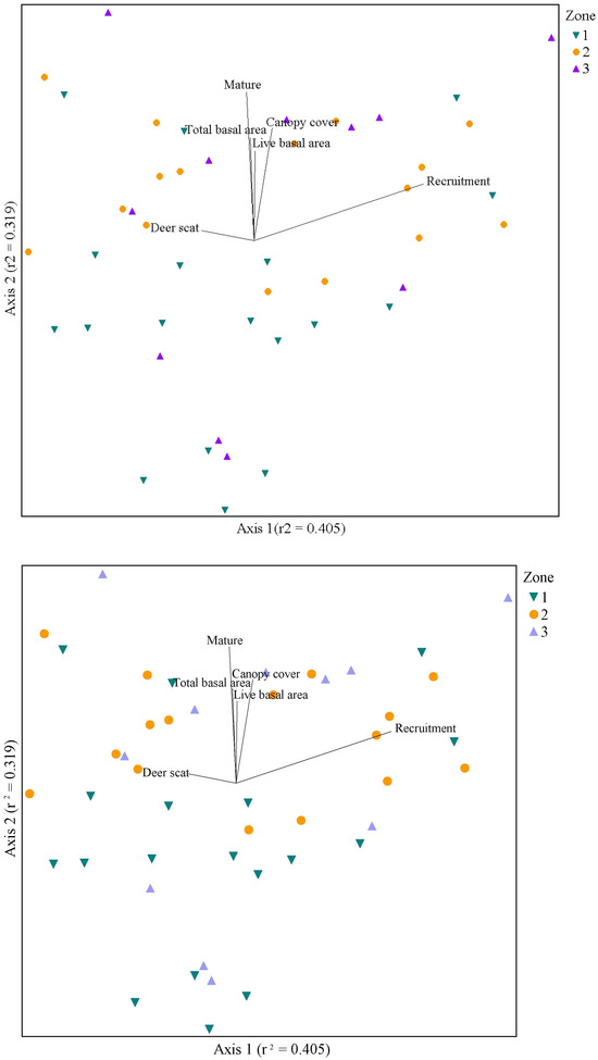 The three-axis result described 88.1% of ordination variance (Axis 1: r2 = 0.405; Axis 2: r2 = 0.319; Axis 3: r2 = 0.158, orthogonality Axis 1 and 2 = 96.5%). Although the significance of each axis does not meet our 95% confidence interval standard (Axis 1 = 0.09, Axis 2 = 0.04, Axis 3 = 0.03), we concluded that the significance is adequate, but should factor into our conclusions. Table 3 presents all environmental variables with their Pearson’s coefficient (r) values by axes identified in NMDS. The NMDS is displayed as one joint plot with Axis 1 and Axis 2, where vectors with >±0.5 Pearson’s coefficient (r) value are displayed as an overlay in Figure 3. The length and direction of vectors in Figure 3 correspond to variable strength and relationship to the two-dimensional plot data space. Axis 1 describes a gradient of recruitment abundance negatively correlated to deer scat presence. Axis 2 displays a gradient of canopy cover, mature ha−1, total basal area, and live basal area. On Axis 3, three variables have high Pearson’s coefficient (r) values, elk scat ha−1 (r = 0.518), deer scat ha−1 (r = 0.685), and Na (r = 0.32). Several variables do not meet our threshold for Figure 3 joint plot display, yet they provide support in their statistical relationships to other variables along dominant ecological gradients. In the joint plots, Zone 1 has less recruitment and poor overstory growth, while Zone 2 trends in opposition to Zone 1. Zone 3 has no dominant trend.