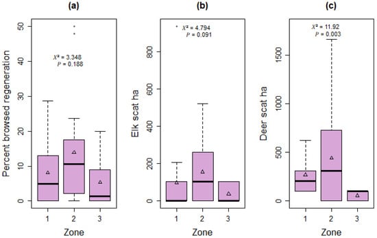 Box plots of nonparametric tests describe study site patterns of regeneration, recruitment, and browsing impacts by Zone. Analysis graphics are as follows: (a) difference in percent browsed for study plots; (b) difference in elk scat ha−1 for all study plots; (c) significant difference in deer scat ha−1 for all study plots. Kruskal–Wallis test results are shown for differences between the three groups, including chi-squared (X2) and significance values (p). The x-axis shows the Zone and the y-axis reports Wilcoxon mean scores. Output from Kruskal–Wallis test whiskers shows minimum and maximum values, where open circles are outliers, boxes represent 25–75% data ranges, horizontal lines within boxes are medians, and open triangle symbols are mean.