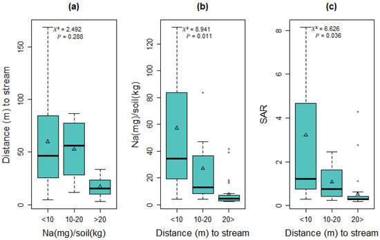 Box plots of nonparametric tests describe sodium (Na), sodium adsorption ratio (SAR), and meters from stream. Analysis graphics are as follows: (a) significant difference in meters from streams for study plots with Na levels of <10 mg/soil kg, 10–20 mg/soil kg, and >20 mg/soil kg; (b) significant difference in levels of Na for study plots <10 m, 10–20 m, and >20 m from streams; and (c) significant difference in SAR for study plots <10 m, 10–20 m, and >20 m from streams. Kruskal–Wallis test results are shown for differences between the three groups, including chi-squared (X2) and significance values (p). The x-axis shows the Zone and the y-axis reports Wilcoxon mean scores. Output from Kruskal–Wallis test whiskers shows minimum and maximum values, where open circles are outliers, boxes represent 25–75% data ranges, horizontal lines within boxes are medians, and open triangle symbols are mean.