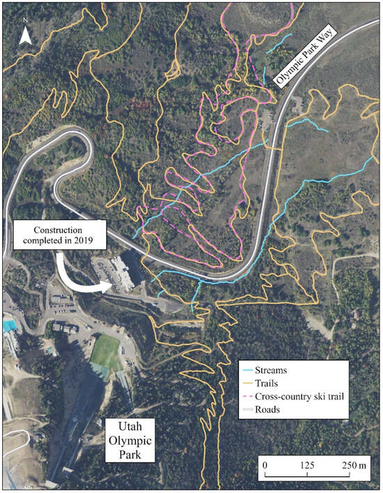 Utah Olympic Park, built for the 2002 Winter Olympics, is upslope and adjacent to the study area boundary and 1.6 km up the road from the RTS/RAM trail area parking lots. In August of 2019, residential housing for Utah Olympic Park was constructed, which altered the perennial and ephemeral path of the streams that flow through RTS/RAM, with the path now descending from a vehicle parking lot. Additional construction for the park is ongoing and may affect run-off content and patterns within the study area.