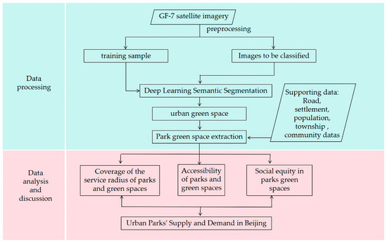 Therefore, this paper focuses on the urban green park space within the fifth ring road of Beijing. It uses Gaofen-7 (GF-7) ultra-high spatial resolution remote sensing images and a deep learning model to extract the green space information within the fifth ring road of Beijing. Different streets serve as the spatial units of the analysis. The paper adopts accessibility analysis and location entropy methods to analyze the urban green park spaces within the fifth ring road from the perspectives of demand–supply alignment and social equity, exploring the spatial allocation and supply–demand relationship of urban parks and green spaces within the fifth ring road of Beijing, analyzed in terms of the following three issues: (1) How can high-spatial-resolution imagery and deep learning algorithms be scientifically applied to identify the green spaces in urban parks? (2) What is the impact of parkland service capacity on per capita access to parkland resources? (3) How does equity in the layout of the city’s parks relate to residents’ accessibility to the parks? The aim is to provide a scientific reference for optimizing the spatial pattern of urban green space.