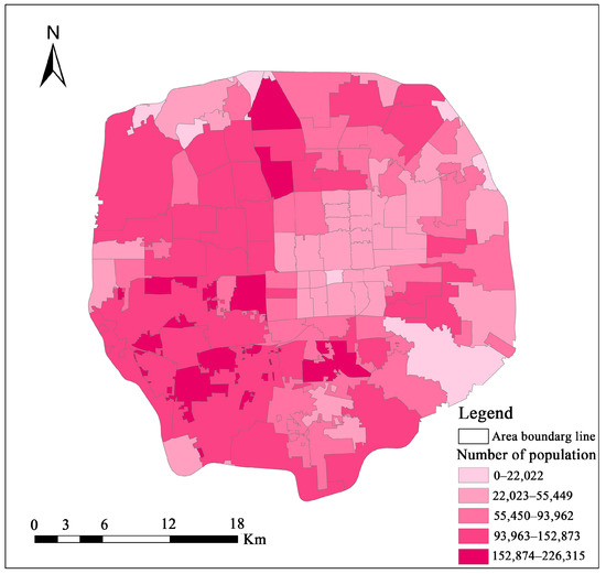 The social supply of green park spaces is evaluated through their social service capacity, employing the density of the resident population as an indicator of residents’ demand for green park spaces. Generally, the higher the population density, the greater the overall demand for green park spaces. In this study, focusing on social equity, we adopted the method of location entropy to calculate the per capita green park space location entropy [58], representing the actual amount of green park space resources per capita in a specific area to analyze the social equity of green park space resources in Beijing. The entropy of green park space per capita can be expressed as: