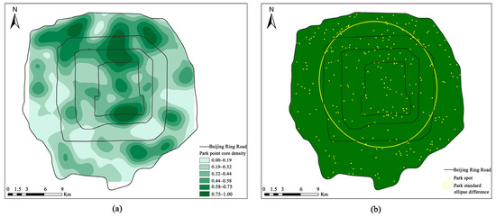 Distribution density and distribution trend of green spaces in parks within the fifth ring road in Beijing: (a) kernel density map of park sites and (b) park distribution standard deviation ellipse.