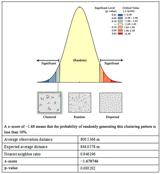 The z-score for green park space within the fifth ring road of Beijing was −1.68, indicating an aggregation pattern, as illustrated in Figure 7. The closest ratio index was 0.94, with the ratio value being between 0.6 and 1, suggesting that the aggregation of green park space is not significant.