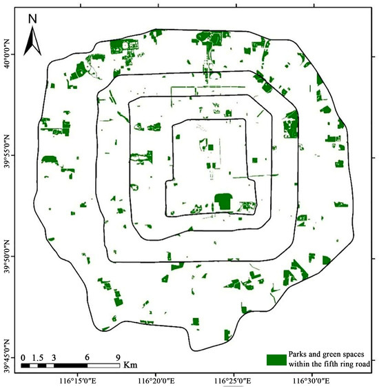 From Figure 8, it can be observed that the parks within the fifth ring road of Beijing are primarily concentrated within the fourth to fifth ring road. In this study, a total of 46.82 km2 of green park space was extracted from the fifth ring road area, with parks exhibiting extensive green space coverage mainly concentrated in the western and northern regions of the fourth and fifth rings.