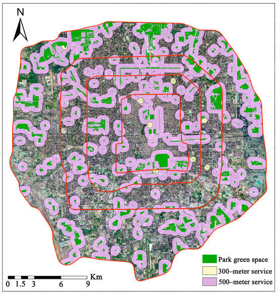 The service radius coverage rate of urban green park space is determined based on the National Garden City Selection Criteria issued by China’s Ministry of Housing and Urban–Rural Development in 2022. This criterion entails the percentage of residential land area covered within the service radius of the green park space. For green park space below 5000 m2, a 300 m service radius is employed, while green park spaces of 5000 m2 and above use a 500 m service radius. Buffer zones of 300 m and 500 m were established based on the size of the park area, and the area of residential land covered by these buffer zones was calculated to derive the coverage ratio of the service radius of urban parks and green spaces: