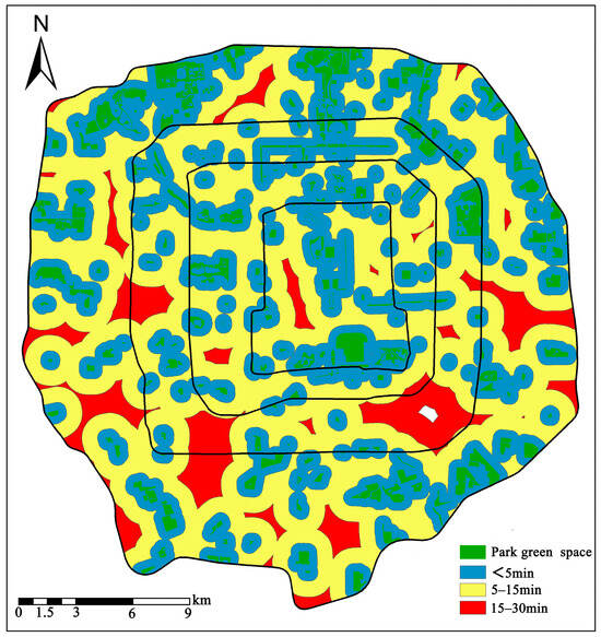 Accessibility refers to the availability and proximity of parks and green spaces within a specified spatial range. It is influenced not only by spatial distance, but also by information and behavior [53]. Accessibility is a vital element in measuring the rationality of the spatial layout of urban services and the quality of life for residents [54,55]. In terms of the accessibility of green spaces in urban parks, walking is the most common mode of travel, unaffected by road traffic conditions. Most residents prefer to walk no more than five minutes to reach green park spaces, with a maximum acceptable walk of 30 min [56]. Taking into account residents’ willingness to travel, this study adopts the concept of the “15-min city” and divides walking time into three levels: no more than 5 min, 15 min, and 30 min. We considered an average walking speed of 5 km/h [57] and corresponding walking distances of 420 m, 1250 m, and 2500 m, respectively. Buffer zones for different time ranges were established accordingly, and the coverage area and the number of neighborhoods covered by different buffer zones were calculated to assess the accessibility of green park space within different time ranges.