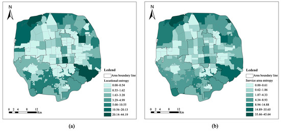 where Tds is the total area of a number of green park spaces accessible to residential land in each street within an effective service radius, Pd is the number of residents on each street, Tqs is the total area of a number of green park spaces accessible to residential land in the study area within an effective service radius, and Pq is the total resident population in the study area. If the location entropy of a street is greater than 1, it indicates that the public per capita enjoyment of parkland in the area is higher than the overall level of the study area. If the location entropy is less than 1, it indicates that the per capita enjoyment of parkland in the area is lower than the overall level of the study area.
