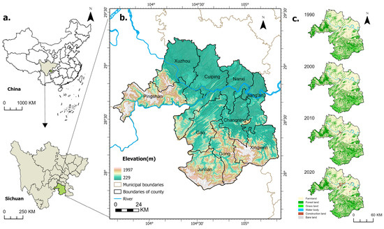 Overview of the study area: (a) location, (b) elevation and administrative units, (c) land use/cover.