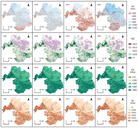 Spatial distribution patterns of the four key ecosystem services, 1990–2020 (WY: water yield; HQ: habitat quality; CS: carbon storage; SC: soil conservation).
