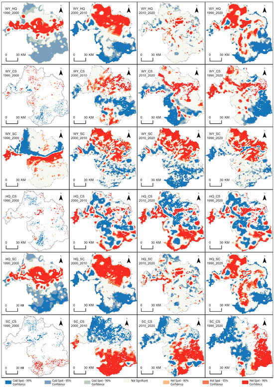 Hotspot statistical analysis of relationships between ESs reveals their spatial and temporal distribution characteristics (Figure 6). In the first period, the hotspot region of the relationship strength between WY and HQ is mainly distributed around the dividing line of rainfall increase and decrease. In these areas, the change in rainfall is less, and its impact on WY and HQ is similar. In the second period, the hotspots are distributed in the plain area of the northeast, and the cold spots are distributed in the southern mountainous area, which may be related to the intensive human activities in the northeast. In the three periods, the relationship strength does not significantly dominate the entire area. Throughout the period, the proportions of hotspots and cold spots are roughly the same, with the former concentrated in the northwest and the latter in the southeast, which is mainly related to the distribution pattern of rainfall. As for WY and CS, in the first two periods, the hotspot regions are mainly distributed in the north, and the cold spot regions are distributed in the south. However, in the third period compared to the entire period, the distribution area of cold and hotspots is opposite, which is mainly related to the change pattern of rainfall. For WY and SC, the distribution of hot and cold spots in the first period lies on both sides of the line demarcating increased and decreased rainfall, with other regions being less significant. In other periods, hotspots are located in the northeastern region, while cold spots are in the southwest, potentially tied to the implementation of the GFGP since 1999, with significant positive effects on soil conservation in southern regions. With regard to HQ and CS, the spatial distribution of hot and cold spots is mirrored across different periods, showing spatial heterogeneity, possibly related to the distribution of vegetation types. The distribution patterns of cold and hotspots between HQ-SC and WY-HQ are akin. As for SC and CS, in the first two periods, hotspots are concentrated in the southern regions while cold spots in the north. This gradually shifts to hotspots in the east and cold spots in the west. Overall, the intensity of the relationship between the six pairs of ecosystem services presents a spatial distribution pattern of high and low clustering. However, the distribution pattern of hot and cold spots in each period is significantly different. This reveals the impact of time and space on their relationship.