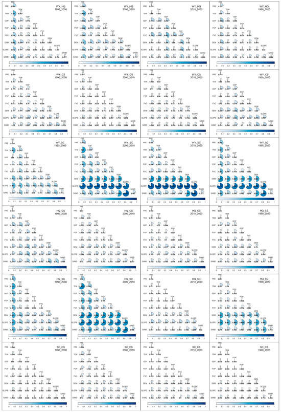 The results of the factor detection and interaction detection of the OPGD are shown in Figure 7. They show that the dominant factors of the trade-offs and synergies between different ESs are different. And the dominant factors in the relationship between the same pair of ESs may also differ across different periods. Over the entire 30-year period, the relationship between WY and HQ was primarily influenced by precipitation, economic, and soil factors. This indicates that we can optimize the relationship between WY and HQ by adjusting economic models and improving soil. Most driving factors showed an increase in q values during the 2000–2010 period and a decrease during the 2010–2020 period. Notably, changes in topography and soil factors were pronounced. This was because the significant reduction in precipitation from 2000 to 2010 elevated the dominant role of soil and topographical characteristics in vegetation growth. In contrast, during the more rain-abundant period of 2010–2020, the influence of soil and topography factors relatively weakened, while the relationship became more influenced by precipitation. The relationship between WY and CS was mainly influenced by topographic, soil and economic factors, and it is noteworthy that the q value for soil sand content decreased from 0.103 to 0.029. This may be because high elevation and steep slopes promote the increase in both, while economic development significantly reduces carbon storage. Throughout the 30 years, precipitation, DEM, and slope played a dominant role in the changes in the intensity of relationship between WY and SC, with q-values of 0.366, 0.492, and 0.699, respectively. This is mainly because soil erosion primarily occurs in mountainous areas with abundant rainfall and steep slopes. This also indicates that this region is a key area for soil erosion control. The relationship between HQ and CS was more influenced by economic, topographic, and soil factors, with the main indicators including GDP, DEM, and soil sand content. This is mainly because both significantly decrease in high economic areas, while high elevation and fertile soil are conducive to a synergistic increase in both. Among the drivers of the relationship between HQ and SC, temperature and topographic factors had higher q-values than other factors. This may be because high temperatures affect vegetation growth. All eight drivers had low effects on the intensity of trade-offs and synergies between SC and CS, with slope having the highest q value of 0.074.