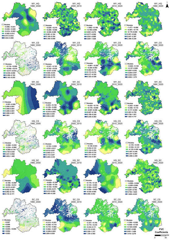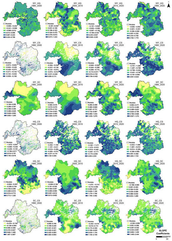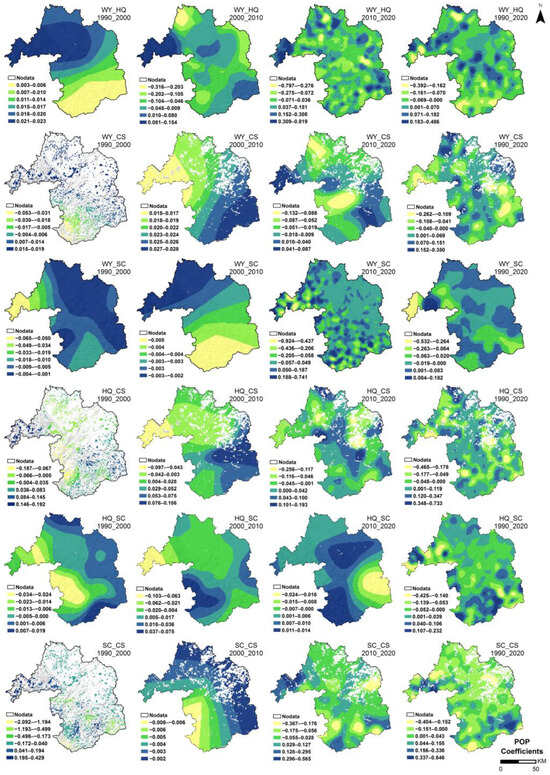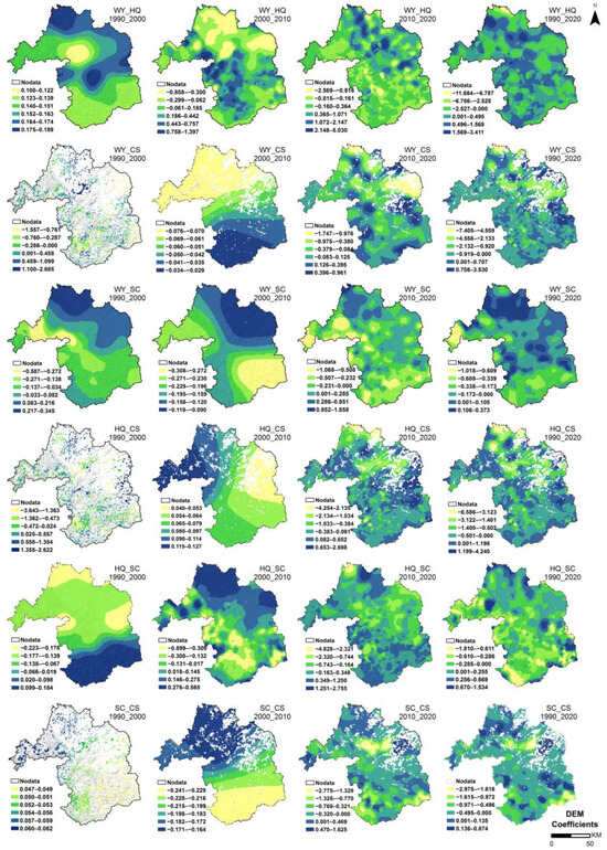 The MGWR coefficients for each driver in Figure 8, Figure 9, Figure 10, Figure 11, Figure 12 and Figure 13 reveal the spatial details of their contribution to the spatiotemporal differentiation in the intensity of trade-offs and synergies between ESs, which has important implications for the development of targeted and actionable ecological improvement actions.