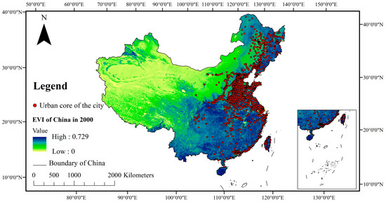 Figure 1. Distribution of urban cores. An MOD13Q1 EVI image of China taken in the 2000 growing season (April–October) serves as the background.