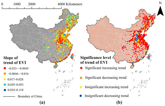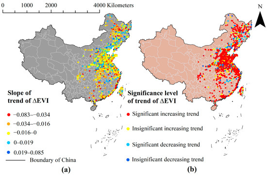 Figure 4. Trends of the difference in EVI between urban cores and rural areas. Data were obtained from MOD13Q1 EVI images of China taken during 2000–2022. (a) Temporal trends in Δ E V I . (b) Significance level of Δ E V I changes.