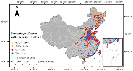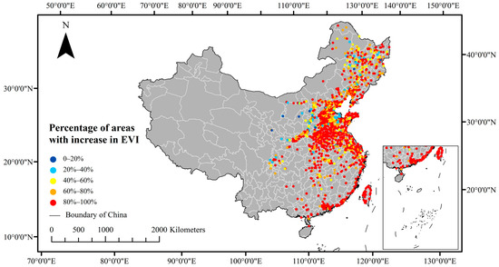 Figure 3. Percentage of areas with EVI increase in 1559 urban cores. Data were obtained from MOD13Q1 EVI images of China taken during 2000–2022.