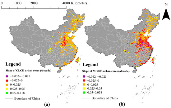 Meanwhile, we observed that the growth rate of EVI in the urban core area captured by MODIS images is generally lower than that in CLCD images. For instance, the urban core with the most rapid vegetation growth achieved an EVI slope of 0.118 (per decade) using CLCD products; in contrast, the highest value obtained from MODIS images is merely 0.058 (per decade), roughly half as much. Furthermore, the disparities in the EVI slopes of the urban cores derived from the two images exhibited significant spatial heterogeneity. Urban cores with substantial variations were concentrated in the North China Plain and the south, with relatively minor variations in the northern urban cores. This discrepancy strongly correlates with the disparity between CLCD and MODIS images. The fundamental issue is that the two have different criteria and results for classifying land cover types (Figure 7). For instance, in MODIS images, pixels with greater than 30% impervious surfaces are classified as urban areas [36], whereas in the CLCD, only pixels with 100% impervious surfaces are categorized as ‘Impervious’. Consequently, our urban core delineation from MODIS images extends further than CLCD and encompasses many pixels with less than 100% impervious surfaces (Figure 8). These areas have experienced urbanization effects since 2000, resulting in a reduction in vegetated areas. Consequently, the results we obtained with MODIS images were significantly different from those obtained with CLCD (Figure 9). The former yielded significantly lower vegetation growth trends than the latter, both in the urban cores and in the rural areas.