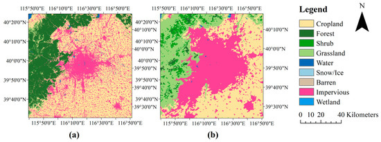 Figure 8. Different urban core and rural area in Beijing from CLCD and MODIS images. (a) Urban core and rural area from CLCD. (b) Urban core and rural area from MODIS images.