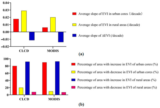 Figure 9. Different results obtained using CLCD versus MODIS images. (a) Differences in the average slope of EVI. (b) Average area percentage of increase and decrease in EVI.