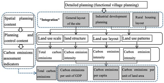 Focusing on the overall goal of carbon emission control based on detailed planning, and referring to the existing low-carbon research [,,,] on the content of village spatial planning, it can be clarified that the control content at the level of detailed planning includes four types of land use elements: land use scale, land use pattern, land use structure, and land use layout. The relationship between the different land use elements and carbon emissions is shown in Figure 1 below.
