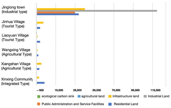 The annual carbon emissions from the built-up land and agricultural land of each village unit can be compared horizontally with the low-carbon land use, as shown in Table 10 below. From which it can be seen that Jinlong Town, as an industrial-type community, has the highest carbon emission efficiency of the built-up land. Xiangshan Village, as an agricultural-type rural area, has a high carbon emission intensity of the built-up land, and it can be seen through the review of the data that the carbon emissions mainly come from the land of the infrastructure, especially the construction of the road, which shows that the high efficiency of the rural infrastructure planning and construction of low-carbon is also an important part of rural It can be seen that the efficient and low-carbon planning and construction of rural infrastructure is also an important part of low-carbon development in rural areas.