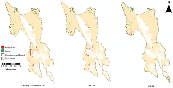 | PlanetScope [29] | 3–4.1 m | Forest Pre- and Post-Change Detection Map | See Table 2. |