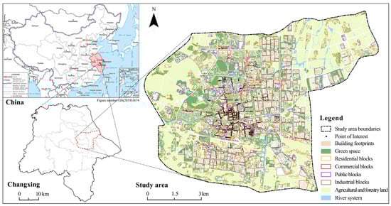 This study involved the following data: (1) The Land Use Map of the Central Urban Area of Changxing County: The land use vector map for the year 2018 was provided by the Changxing County Construction Bureau, which displays the area and spatial distribution of different types of blocks in the urban area. (2) Building footprints: Based on the 2018 Changxing County central urban digital elevation map (DEM) data, the area, perimeter, and floor number of buildings of different properties were extracted by classification and then combined with manual correction to obtain complete building information. (3) Green area information: Based on Google’s high-precision historical remote sensing images in 2018 on the Ovi Maps platform, the extraction of green space information on blocks was achieved using the Alibaba DAMO Academy’s AI Earth platform (https://engine-aiearth.aliyun.com, accessed on 8 September 2023). (4) Population data: The population data at the block level in the central urban area in 2018 were provided by the Public Security Bureau of Changxing County. (5) Point of interest (POI): This was obtained based on the Peking University Open Research Data Platform (https://opendata.pku.edu.cn, accessed on 15 September 2023). (6) Energy consumption data: The annual electricity consumption data for block-level land units in 2018 was provided by Changxing County Power Supply Company.