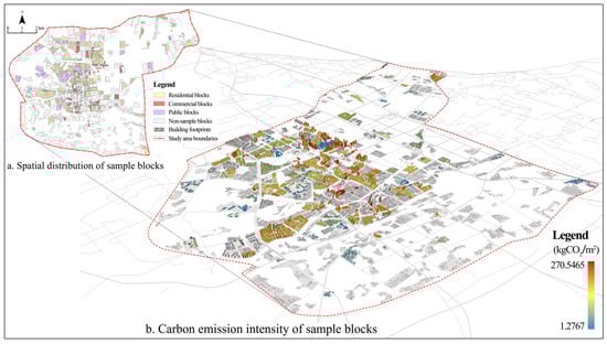 In this study, urban construction land primarily refers to residential blocks (RBs), commercial blocks (CBs), and public blocks (PBs). Industrial blocks were not included in this study, mainly due to the fact that the carbon intensity of industrial blocks is more affected by the type of industry, technology level, and energy structure, etc. []. This research employed a sampling survey approach to select samples from these three types of urban blocks. The sample sizes of RBs, CBs, and PBs were selected as 106, 49, and 54, respectively, representing 27.3%, 31.6%, and 47.8% of the total number of corresponding blocks. The samples were widely distributed across different regions of the central urban area (Figure 2a), ensuring the representativeness of the samples in terms of quantity and spatial distribution. It is worth noting that the energy consumption of these three types of block accounts for a relatively high proportion of the city’s total energy consumption []. Moreover, the electricity consumption of the sampled blocks accounted for over 93% of the total energy consumption during the building operation stage, with most ratios exceeding 99% []. These findings were consistent with existing research conclusions []. This study used electrical energy consumption to represent the total energy consumption of the building operations. Therefore, based on the annual electricity consumption data of the sampled blocks, carbon emissions were calculated using the carbon emission factor method []. The carbon emission intensity for the different block types was determined by the total carbon emissions ratio on that block compared to the block area. Figure 2a illustrates the spatial distribution of the sample blocks; Figure 2b shows the carbon intensity of the blocks expressed in terms of building form.
