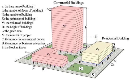 Based on previous research, this paper constructed a comprehensive density measurement system that reflects the distribution characteristics of the physical environment and socioeconomic factors on the blocks (Figure 3). Among them, physical environmental factors (PEFs) mainly refer to artificial environments such as buildings, facilities, and landscapes on the blocks. Factors such as the floor area ratio (FAR), building density (BD) [], building height (BH) [], building facade index (BFI) [], building quantity density (BQD), land use mix density (LMD) [], building congestion degree (BCD), and green area ratio (GAR) were selected to represent these factors. Considering the diversity of building heights on the blocks, three factors [,], namely, the average building height (ABH), maximum building height (MBH), and standard deviation of the building height (SDBH), were selected to describe the building height characteristics accurately. Socioeconomic factors (SEFs) mainly refer to population distribution, economic vitality, and other non-physical environments on the blocks. Three factors, namely, the population density (PD), commercial outlet density (COD), and business enterprise density (BED), were selected to represent the SEFs. Among them, PD represents social factors on the blocks. The density of commercial outlets and business enterprises, as the main body of the city’s tertiary industry, can indicate the level of economic activity on blocks []. Commercial outlets mainly include life services, catering, shopping, automobile and motorcycle services, and other commercial types. Business enterprises mainly include corporate enterprises, financial insurance enterprises, and other enterprise types. Table 1 and Figure 3 show the specific descriptions of the density factors. Table 2 reports descriptive statistics for the dependent variable and all the independent variables. The blocks’ density and carbon emission intensity characteristics are shown in the Supplementary Materials.