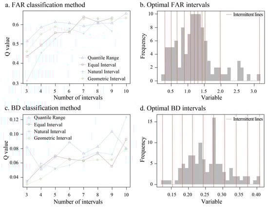 Based on the OPGD, the interval number was set to 3–10 during the discretization process of each density factor. Taking the FAR and BD of RB as an example, for the FAR, when the classification method was the quantile range and the number of categories was ten, the q-value was the highest (Figure 4a), so the quantile range was used to divide the FAR into ten categories (Figure 4b). In the same way, the geometric interval was used to divide BD into ten categories (Figure 4c,d). The principle of discretization of the other density factors was the same.