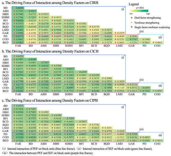 The factor detection results (Table 3, column b) indicated that six factors, including the FAR, ABH, SDBH, BQD, PD, and BED, passed the significance test. Overall, the single-factor driving force showed that the explanatory power of the PEFs (q: 0.3715–0.5378) was greater than that of the SEFs (q: 0.4204–0.4993). In the PEFs, the FAR (0.5378) had the strongest explanatory power. The ABH (0.4902), SDBH (0.4088), and BQD (0.3715) also had a high impact, indicating that the intensity of land development, building height, and quantity characteristics significantly had a significant driving effect on the CICB. In the SEFs, the BED (0.4993) and PD (0.4204) showed a high explanatory power. However, the COD did not exhibit a correlation with the CICB.