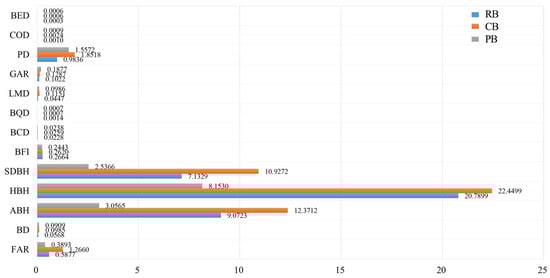The results of the interaction detection (Figure 5c) indicated that, firstly, in terms of the interaction among the PEFs, the explanatory power of the FAR, BD, and SDBH after interaction with various factors performed well, with average q-value of 0.7035, 0.7041, and 0.6853, respectively. Among them, the interactions between the FAR and MBH and between the MBH and BCD showed relatively strong explanatory power with linear and nonlinear enhancements, respectively, and with q-value of 0.8326 and 0.8067. Secondly, in terms of the interaction among the SEFs, the explanatory power of each factor’s interaction was moderate, with average q-value of 0.5078. The interaction between the PD and BED showed a slightly better explanatory power. It showed a linear enhancement with a q-value of 0.6366, indicating that the interaction of the SEFs was not the dominant factor in the CIPB. Finally, in terms of the interaction between the PEFs and SEFs, the overall explanatory power of their interactions was quite strong. In particular, the interaction between the FAR and PD exhibited the strongest explanatory power and a showed significant nonlinear enhancement, with a q-value of 0.9396. This result indicated that the synergistic effect of the two could explain 93.96% of the CIPB, highlighting the decisive role of land development intensity and population distribution in determining the CIPB. It is worth noting that during the individual factor detection, there was no correlation between the COD, BFI, and CIPB. However, after considering the interaction between the COD and FAR and the interaction between the PD and SDBH, their explanatory power significantly increased, showing a significant nonlinear strengthening effect, with q-value of 0.9220 and 0.8337, respectively, ranking just below the highest value.