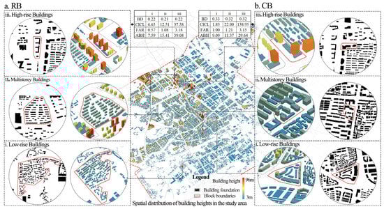 For other density factors, previous research has mainly focused on the relationship between residential land density indicators and carbon emissions, with differences primarily observed in terms of building density [,]. As density is a quantitative indicator that describes the urban form and has significant three-dimensional characteristics, this study aimed to further clarify the relationship between the building density (BD) and the CICL by analyzing the spatial form of blocks. First, based on Table 2, we extracted and compared the SD values reflecting the dispersion of the density indicators (Figure 6). We found that three indicators reflecting the building height on construction land, namely, the ABH, HBH, and SDBH, had very high discretization levels. Additionally, the variation in the building height on the RB and CB was significantly greater than that on the PB, indicating that the three-dimensional spatial diversity of the RB and CB was much higher than that of the PB, suggesting a certain level of convergence in the spatial form of the PB. When we selected three typical blocks separately from the RB and CB, with similar levels of BD, we observed significant differences in the spatial forms of the same block type, representing three common spatial patterns in cities: high-rise, multi-story, and low-rise buildings. Figure 7 clearly demonstrates the differences in the spatial patterns of the blocks at similar levels of BD in the RB and CB. We found that the carbon emission intensity increased for the selected RB units as the FAR and ABH increased. However, due to the differences in the three-dimensional spatial form (Figure 7a), the BD remained unchanged, indicating no correlation between the BD and CIRB. This finding was similarly observed in the CB (Figure 7b). However, the significant driving effect of the interaction of these factors on the CICL indicated that the influence of the BD may be mediated, meaning that the driving impact of the BD needs to be manifested significantly through interactions with factors such as the FAR and ABH. The convergence of the three-dimensional spatial form on the PB also resulted in a correlation between the BD and CIPB. Overall, the spatial form of specific land types affects the relationship between density factors and the CICL. This result aligns with existing research conclusions that “different community forms, such as BD and building form, have varying effects on residential energy consumption” [,]. This study also discovered that this characteristic applies to other land types.