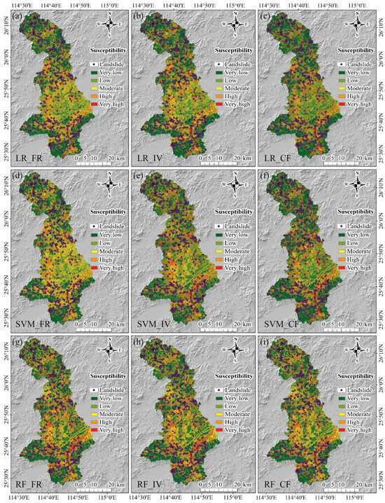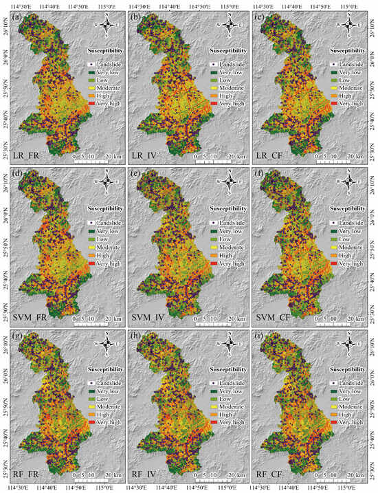 The LSMs using different models and the quantile classification method. (a) LR_FR, (b) LR_IV, (c) LR_CF, (d) SVM_FR, (e) SVM_IV, (f) SVM_CF, (g) RF_FR, (h) RF_IV, and (i) RF_CF.