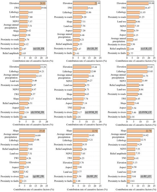 Figure 7 shows the contribution rate of the landslide causative factors obtained using the different models; the contribution rate represents the relative importance of causative factors in landslide events. In LR_FR, LR_IV, and LR_CF, elevation, the TWI, and lithology contributed more to landslides than the other causative factors, with contribution rates of 24.01%, 19.86%, and 8.05% in LR_FR; 21.99%, 13.61%, and 11.86% in LR_IV; and 19.88%, 16.47%, and 11.93% in LR_CF, respectively. In SVM_FR, SVM_IV, and SVM_CF, elevation, lithology, and the average annual precipitation contributed more to landslides than the other causative factors, with contribution rates of 15.29%, 14.21%, and 12.15% in SVM_FR; 13.44%, 12.80%, and 11.44% in SVM_IV; and 15.05%, 15.05%, and 11.75% in SVM_CF, respectively. In RF_FR, RF_IV, and RF_CF, slope, the average annual precipitation, and lithology contributed the most to landslide occurrence, with contribution rates of 23.45%, 14.09%, and 13.08% in RF_FR; 22.92%, 14.45%, and 13.21% in RF_IV; and 22.70%, 14.42%, and 12.31% in RF_CF, respectively.