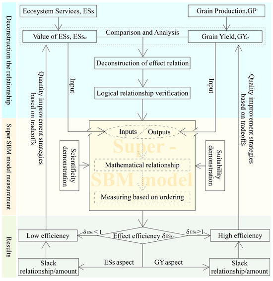 This study aims to propose a scientific method to quantify ESs’ efficiency in supporting GP, in order to contribute to the coordinated development of ecological and food security. It mainly covers four aspects: (1) the deconstruction of the relationship between regional ESs and GP, simplifying the complex GP process into a simplified input–output issue; (2) the introduction of the Super-SBM model based on slack measurement to assess the support efficiency of ESs for GP in the study area; (3) the validation of the measurement method’s scientific basis, appropriateness, and effectiveness; (4) the analysis of the interaction and support efficiency between ESs and GP, and the proposal of optimization strategies for tradeoff ecological environment and GP. The specific research process is depicted in Figure 2.