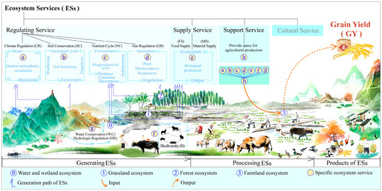 ESs serve as a necessary foundation for GP, their role in GP is a composite process. As defined by Costanza et al. [34], ESs are the benefits that humans derive from ecosystems. These benefits are primarily manifested in the aspects illustrated in Figure 3: (1) Ecosystem support services are the foundation that underpins all human production and living activities and are essential for the existence and development of GP [5,35]. (2) GP is inevitably based on the suitable climate environment generated by ecosystem climate regulation services [6]. (3) The water supply generated by water conservation services is a necessary foundation for GP [36]. (4) Soil formation and conservation is another indispensable condition for GP [35]. (5) Biodiversity services control agricultural pests through the food chain to a certain extent [7]. (6) Based on gas regulation services, plants accumulate and cycle nutrients through photosynthesis and respiration [37]. (7) Ultimately, the various types of ESs mentioned above affect the GP process by impacting the ecosystem supply services, thereby forming an influence on the supply of GP (indicated by grain yield, GY). Overall, GP is an industrial form based on supporting services, relying on regulating services, and achieved through supply services [1,6,9]. In other words, GP relies on the supply of various Ess; therefore, this study takes ESs as inputs and GY as outputs, abstracting the complex GP process into a simple input–output issue, and introducing efficiency measurement methods from economics to measure the efficiency of ESs in supporting GY.
