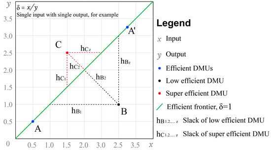 The efficiency measured by the Super-SBM model refers to the analysis and measurement of the relative position and distance between decision-making units (DMUs) and in essence, the efficient frontier. The Super-SBM model involves two main aspects: DMUs and the efficient frontier. DMU refers to the elementary unit used for measurement, while the efficient frontier refers to the multi-dimensional space formed by the efficient DMUs [38,48]. The efficiency is measured by detecting the relative position and distance from the DMUs to the efficient frontier. The Super-SBM model is a non-parametric approach for measuring the relative efficiency of the input and output processes of multiple DMUs [48]. The basic principle is as follows: taking single-factor inputs and outputs as an example (Figure 4). The Super-SBM model initially determines the relative position of each DMU (A, A’, B, C) by utilizing the mathematical relationships (δ) between inputs (x) and outputs (y). Subsequently, the set of relative positions of the DMUs with δ = 1 is taken as the efficiency frontier. Then, the efficiency of each DMU is determined based on its relative position to the efficient frontier. The DMUs (A and A’) are considered efficient when δ = 1, and the DMU (C) is super-efficient when δ > 1. Otherwise, the DMU (B) is considered to have low efficiency when δ < 1. Concurrently, the Super-SBM model measures the slacks (, ) between inputs and outputs by calculating the distance of each DMU to the efficient frontier, serving as a basis for tradeoff in optimizing strategies between inputs and outputs [38,48]. Ultimately, in research based on the Super-SBM model, the simulation of the efficient frontier necessitates a significant number of DMUs to ensure its effectiveness and precision to the greatest extent [48].