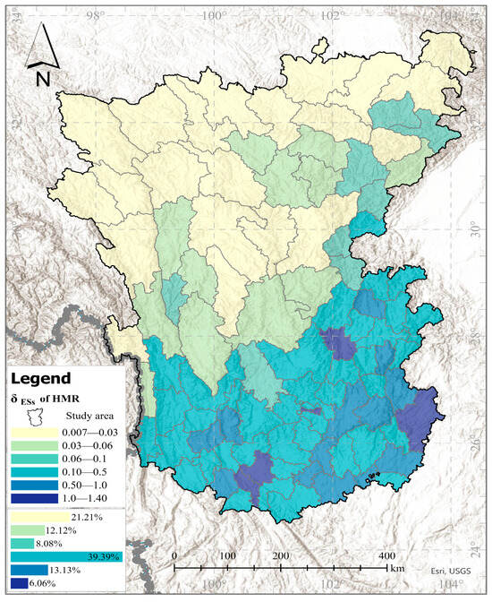 The in the HMR generally exhibits a spatial distribution pattern of being higher in the south and lower in the north. In the northern counties, the is mostly below 0.06 accounting for 33.33% of the total counties. Notably, the is mostly below 0.01 in the northwestern region of the HMR, with the lowest value being only 0.007 (Seda County in Sichuan Province). In contrast, the in the southern counties is relatively higher, often above 0.06. Counties with values between 0.06 and 0.1 make up 39.39% of the total number of counties. Additionally, among the southern counties, six counties have values that exceed 1.0. Among them, Huize County in Yunnan Province has a reaching 1.40, which is the highest in the entire HMR (Figure 6). From the analysis of the differences in extreme values, the ranges from a high of 1.40 to a low of 0.007, showing a disparity of over 200 times, which indicating that there are huge gaps in the capacity and level of utilization of ESs for GP among counties in the HMR. Overall, the in the HMR markedly presents a differentiated spatial distribution pattern with a stronger efficiency in the south and a weaker one in the north, most counties have a low level of ESs utilization and insufficient capacity to GP, which may be one of the main factors impeding the development of regional agriculture.