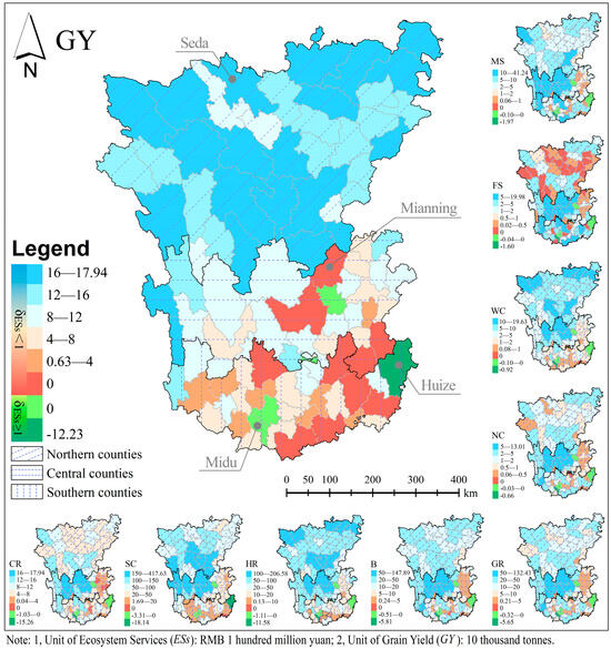 The efficiency frontier of ESs for GP in the counties of HMR conforms to the objective reality of regional GP. From the perspective of GY, Xiangyun County and Huize County in Yunnan Province, and Xichang City in Sichuan Province are counties with relatively high GY, all with outputs exceeding 200 thousand tons, with Huize County reaching up to 462.3 thousand tons. In terms of grain production efficiency (), Xianyun County and Huize County in Yunnan Province, Midu County, and the Eastern and Western districts of Panzhihua City are counties with relatively high , which can reach more than 400 tons per square kilometer. Considering the aforementioned dimensions, the efficiency frontier measured by the Super-SBM model conforms to the objective reality of regional GP and can reflect the basic characteristics of regional GP.